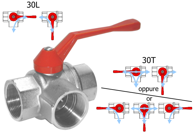 型号 30T/30L 缩口径三通球阀 尺寸:DN010 - 3/8" 至 DN050 - 2"内螺纹/内螺纹/内螺纹 (ISO 228/1) 两个阀座密封(中间的连接为常开,无阀座)可调节调料具体型号如下:● "L"型阀球● "T"型阀球俄罗斯Gost认证 PN16 工作条件:● 介质(水): 0°C 至 150°C● 介质(气): -30°C 至 150°C